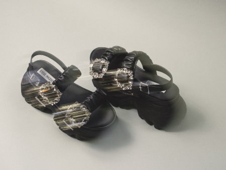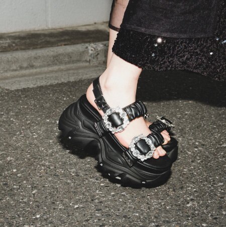 まるでジュエリーのように輝くバックルと、インパクトのある厚底ソール。
