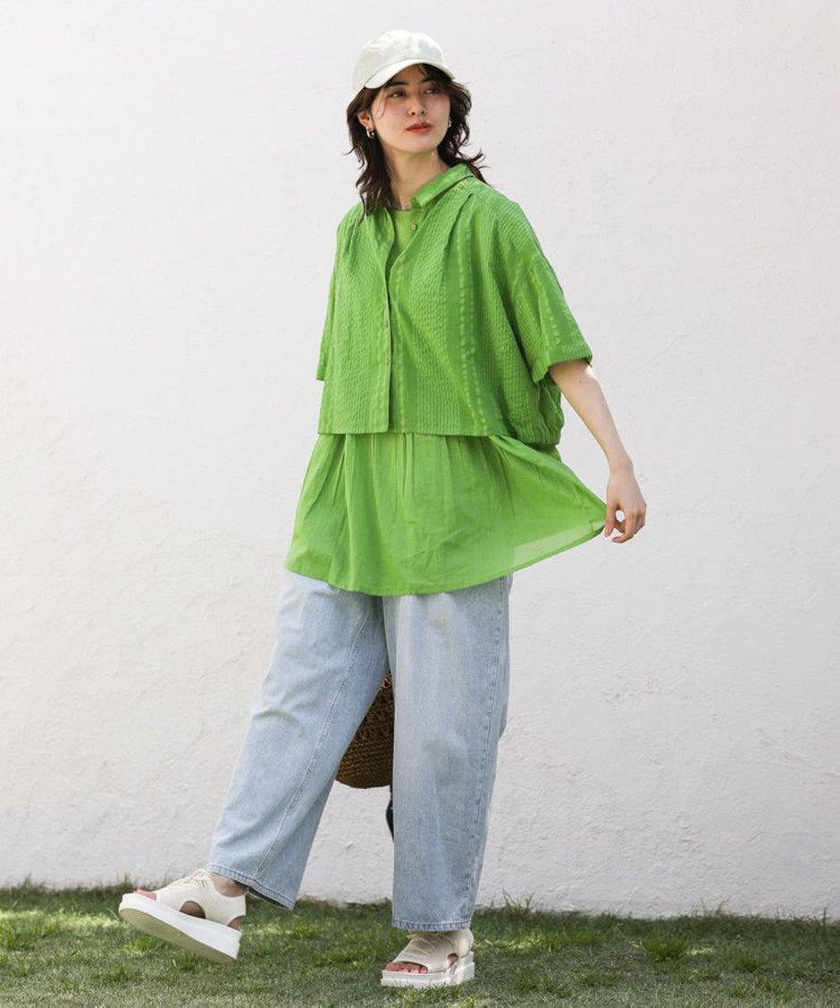 ③ショート丈シャツ+長めインナーで、トレンドも抑えつつ体型カバーが叶う◎