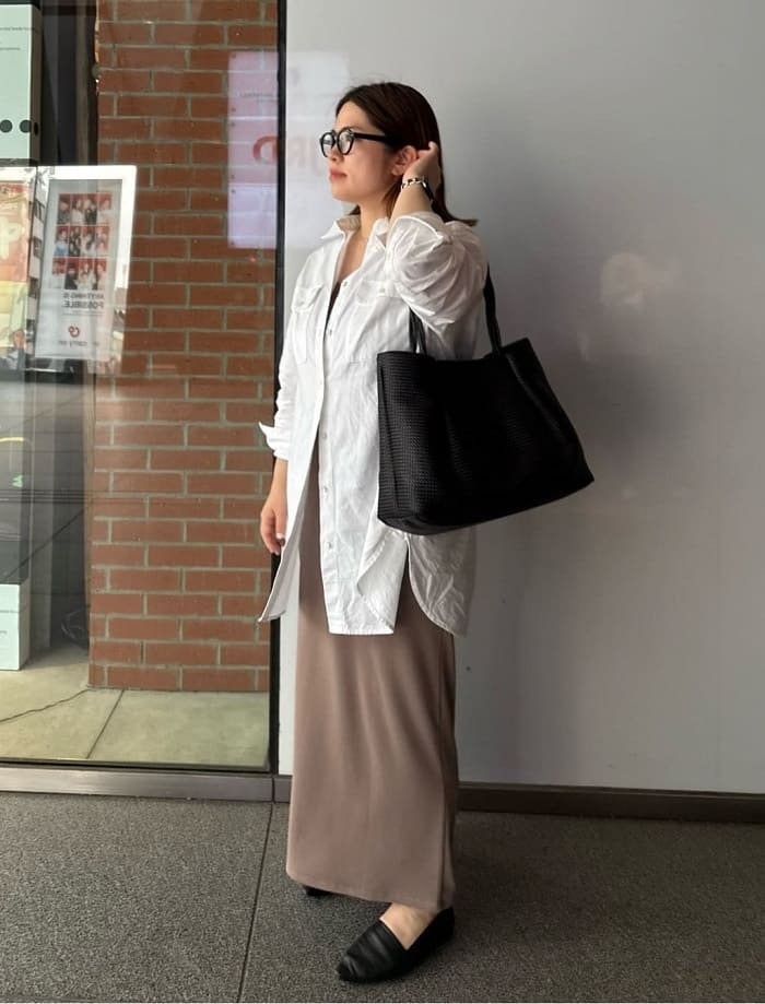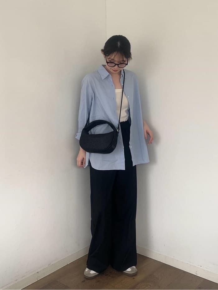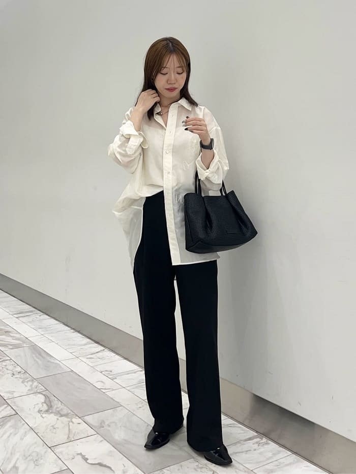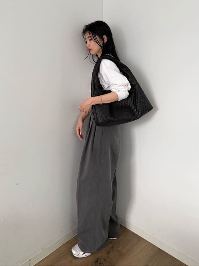バッグの素材感が際立ち、都会的なムードに仕上がります。