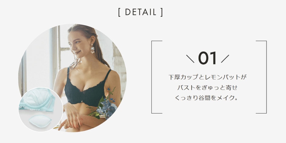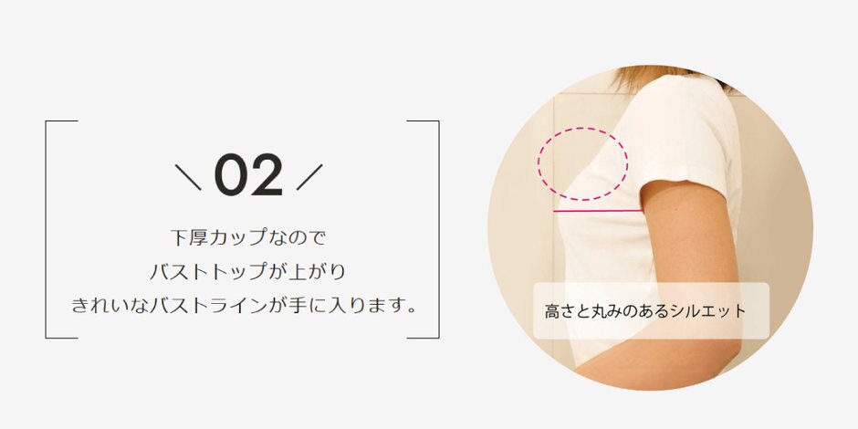 また下厚のモールドカップ、肩部分のW吊り上げテープ、乳間のテープの相乗効果で谷間とリフトアップを演出する、