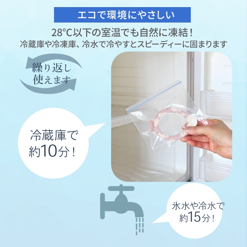 首にかけると心地良いひんやり感が続く28℃クールリングです。