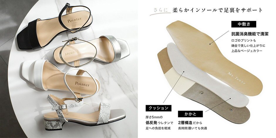 Pointerのサンダルは、足にしっかりフィットしてクッションもたっぷりだから、長時間履いても疲れにくいのがポイント。さらに軽くて、抗菌防臭、着脱も超簡単。シンプルだけど上品でおしゃれ、ラクなのにちゃんとキレイが叶う、この夏イチオシのサンダルです!