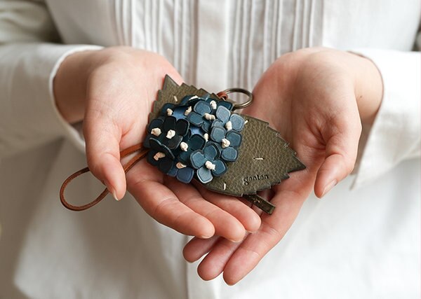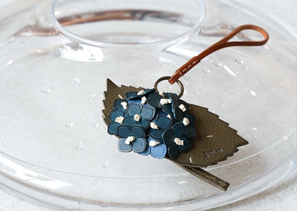 いくつもの小さな花が集まって花房をつくる集合花。その姿を表現しようと、職人が革一枚一枚を重ねて仕立てました。花びらに2色の青い革を使うことで奥行きのある表情に。