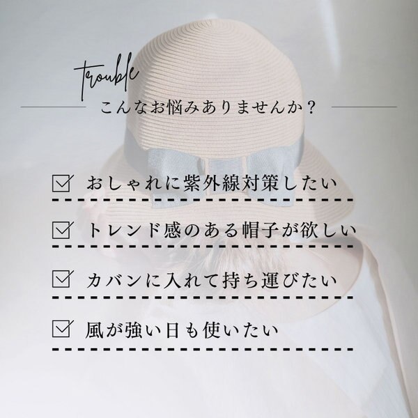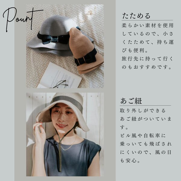 取り外しができるあご紐付き。ビル風や自転車に乗っていても飛ばされにくいので、風の日も安心。あなただけのお気に入りを見つけてみてくださいね♪