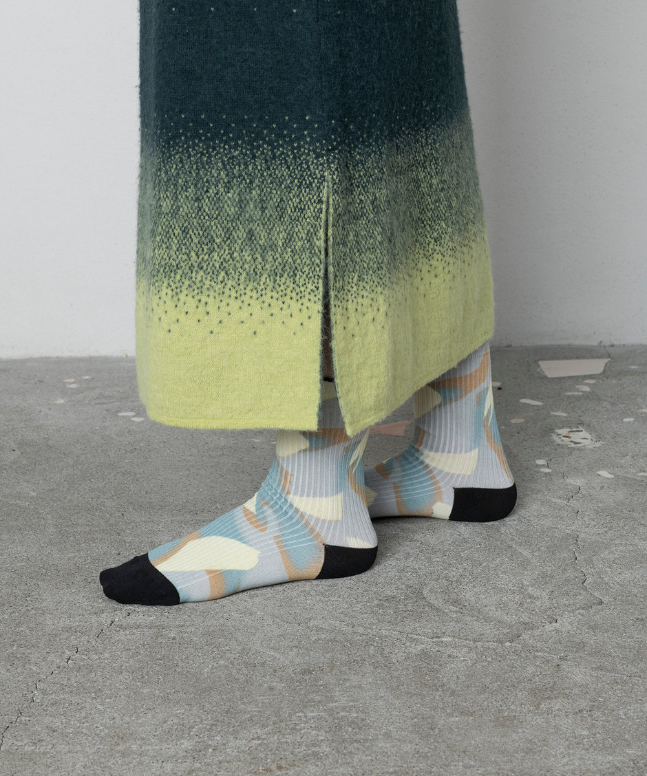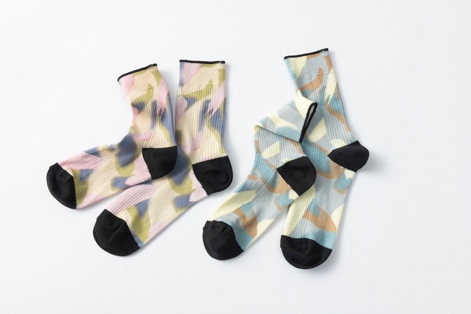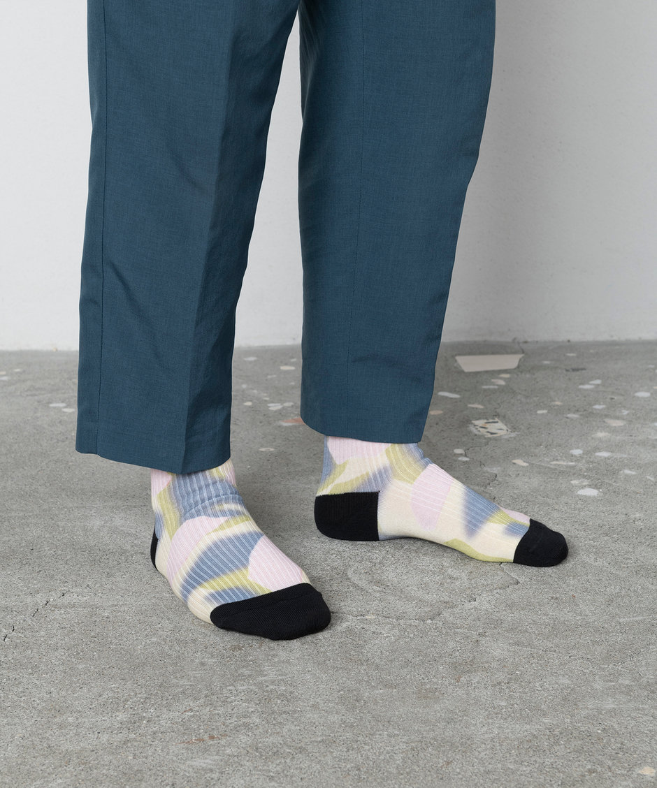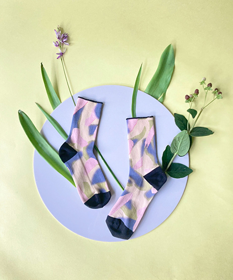 花びらが舞うシーンをパターン柄にしたプリントソックス。凹凸感のあるリブ編みの生地に、細かい柄表現ができる3Dインクジェットプリント機でプリントされた商品です。