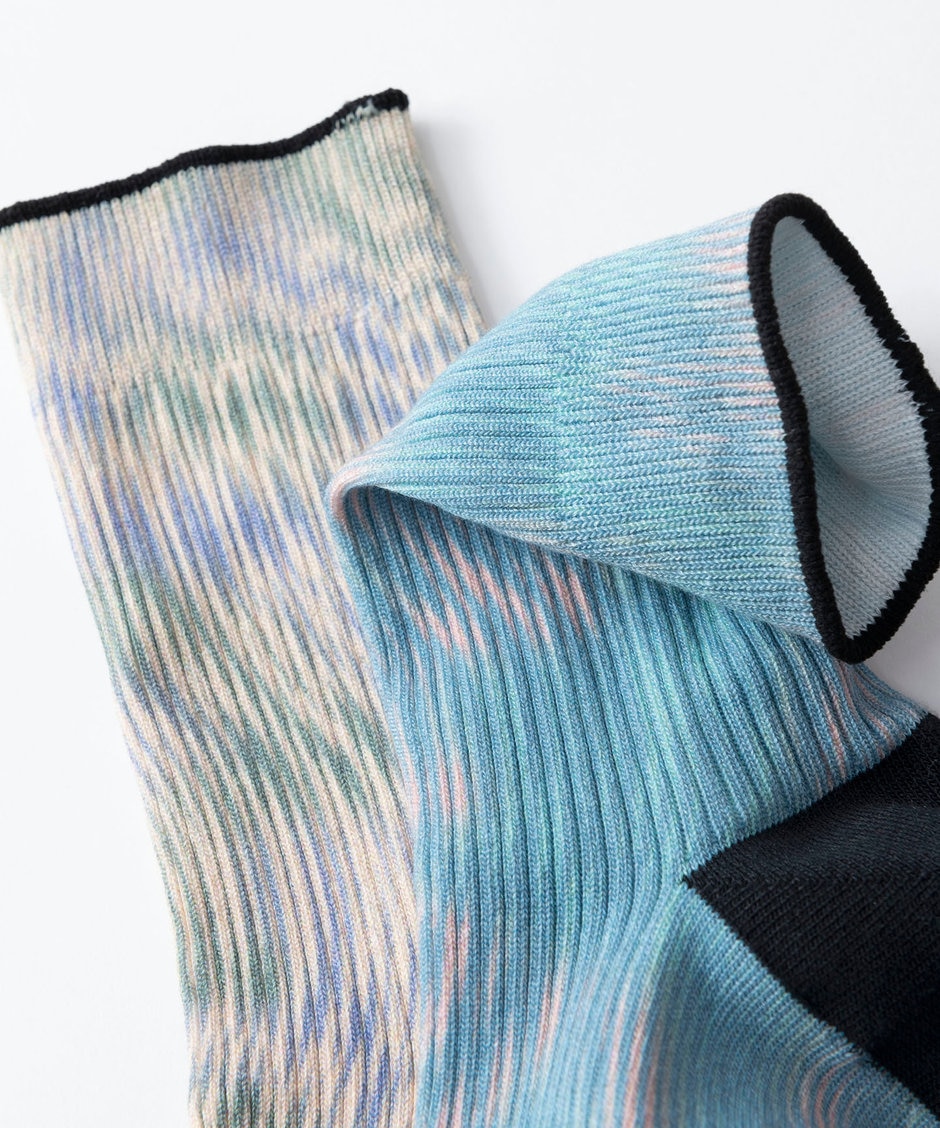 2種類の異なる糸を使用した、カジュアルで爽やかなボーダー柄ソックス。様々なカラーが使われているので、靴を履いた時と脱いだ時では見え方の印象ががらっと変わります。