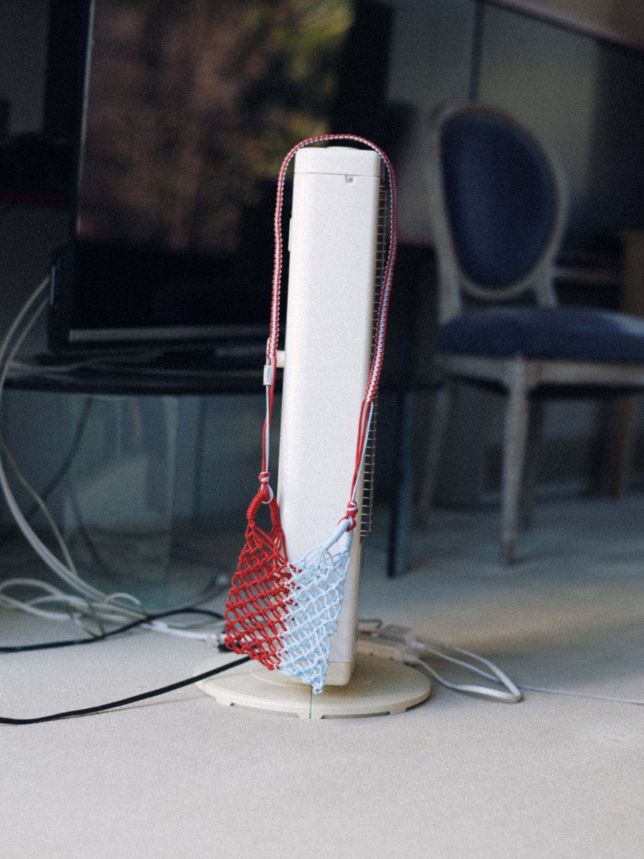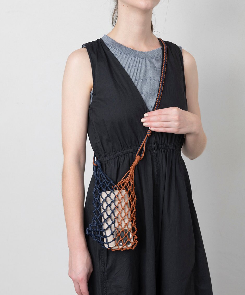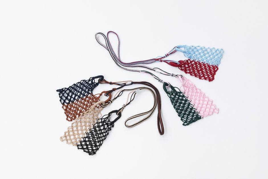 1本の細い紐から作り上げるマクラメ編みは、中が見えるくらいに粗く編んでいるので伸縮性があります。