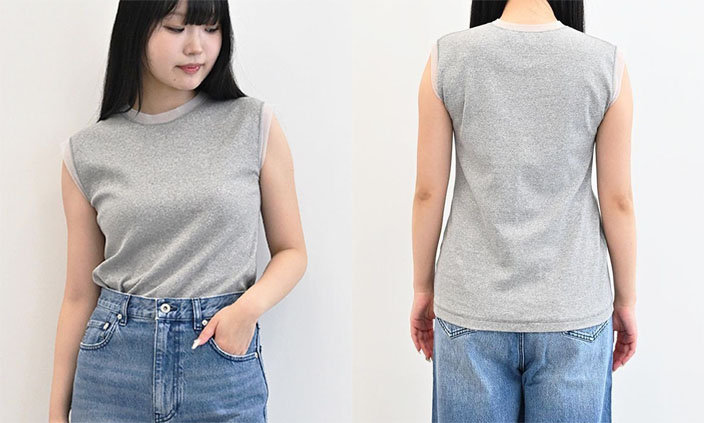 ノースリーブ調のアイテムでありながら、肌の露出を控え目にしたデザインが特徴のクルーネックトップス。