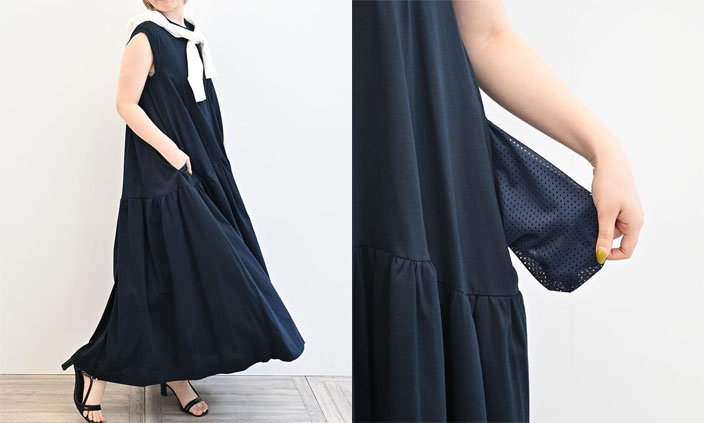 02/ ジャージ素材で通気性が抜群。ロングジャージードレス