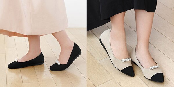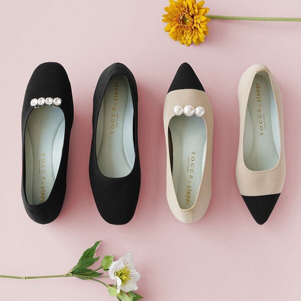 ニットシューズsteppiとのコラボシューズ。脱げにくいようにかかとのフィット感が強いので、ワンサイズアップが履きやすいです。バレエとポインテッドの2つのデザインと、パールとビジューの2種類のクリップをご用意しております。