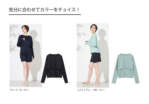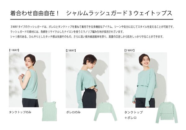 上に重ねるボレロは、両サイドにスリット入り。手の甲までカバーするランバージャック仕様で、手の紫外線対策ができます。タンクトップは、ややタイトなフィット感。それぞれ単体で着用するのはもちろん、重ねて着ることもでき、シーンに合わせてコーディネートの変化を楽しめます。