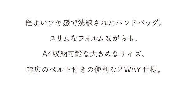 縦長フォルムのハンドバッグはA4サイズがすっきり収まる大容量ながら、スリムで洗練されたシルエット。