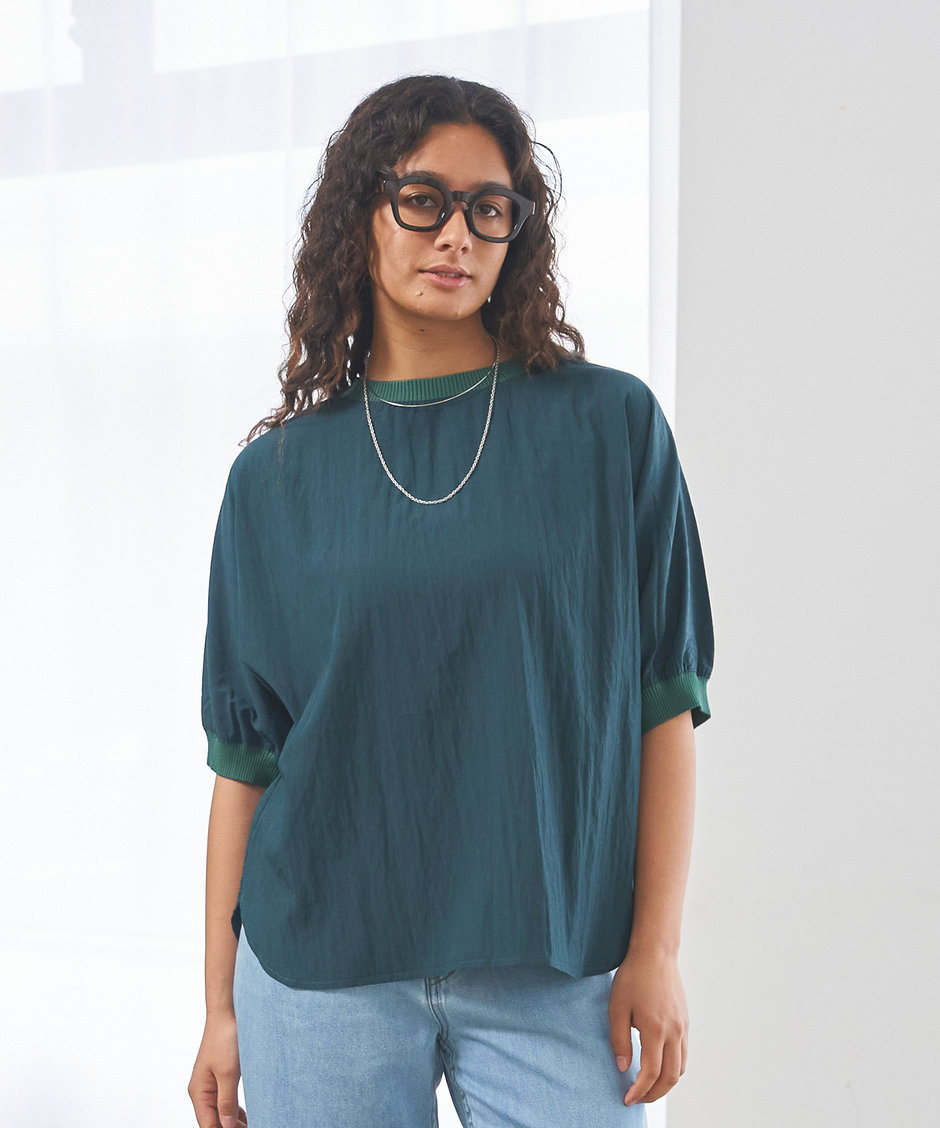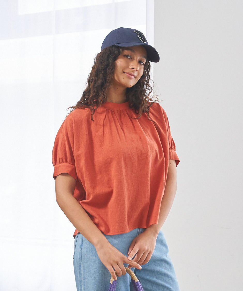 生地に凹凸感のあるコットン素材を使用し、通気性に優れて軽やかなドルマンブラウス。