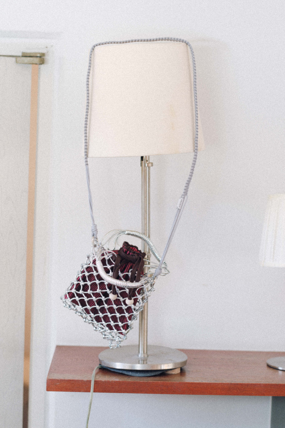 シルバーのマクラメと、ポーチの紐先に付いたウッドパーツが、涼しげで夏らしい印象を与えてくれます。