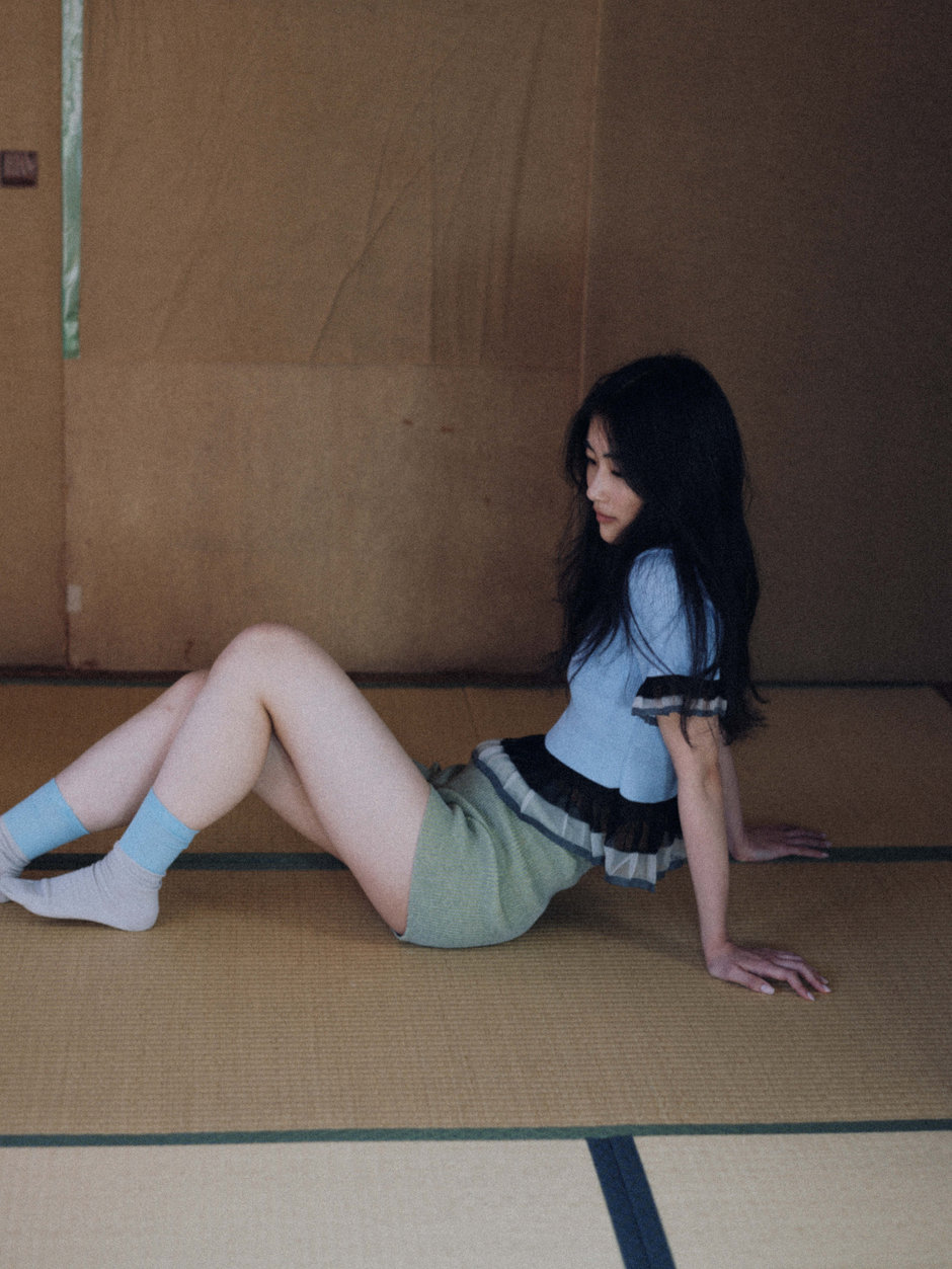 透け感のある2種類の生地を使用した、メローステッチがアクセントのソックス。ラメが入っているので、存在感があり女性らしいデザインです。