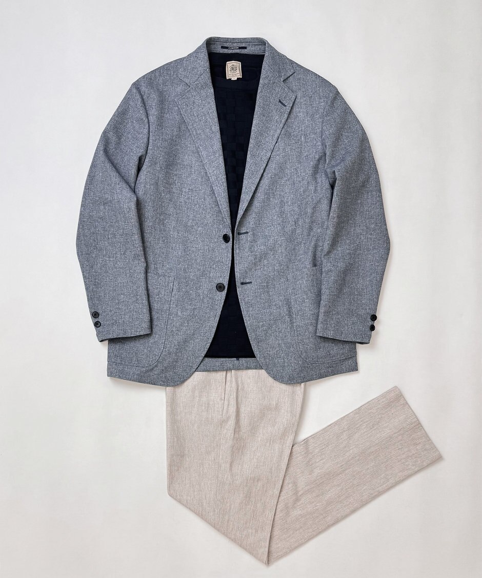 ジャケットとシャツをブルー系統の色合わせで、見た目も着心地も涼しく爽やかに!