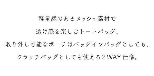 メッシュトートのメッシュ部分は二重構造で型崩れしにくく、スタイリッシュな印象をキープ。
