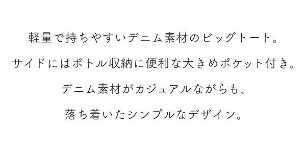 デニムトートのサイドには便利なポケットを備え、ボトルや折りたたみ傘などの収納にもスマートに対応。