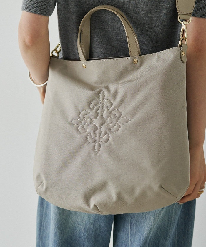 バッグのフロントにあしらわれたモノグラムモチーフの刺繍は、さりげなくも存在感のあるデザイン。
