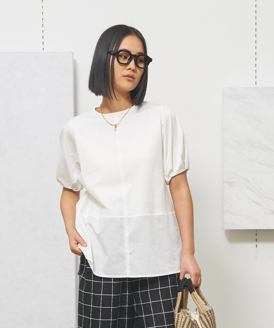 伸縮性があり、さらりとした肌触りが魅力で、ふくらみのある袖が二の腕周りをカバー。