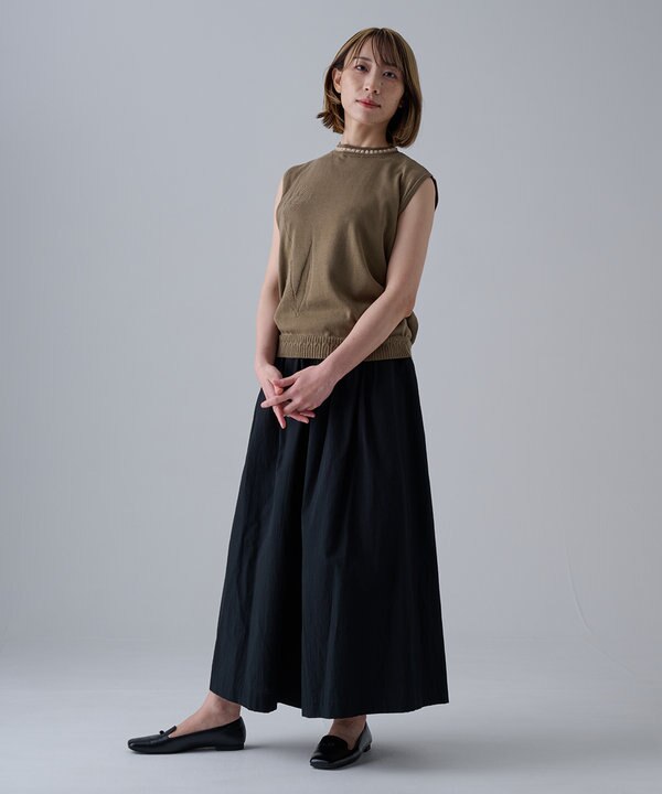 このルックでは、夏に着て涼しい、コットンのサマーニットを合わせています。