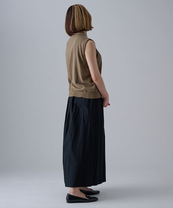 股上の深いこのワイドパンツにタックインすると、さらに上半身が短く見え、よりスッキリした見え方になります。