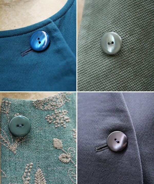 実はボタンには、ブランド設立当初からいろいろな試行錯誤がありました。異素材のボタンをつくったり、プリントしてみたり・・・。ただ、ボタンに大きなコストを費やすわけにもいかないため、さらに様々試した結果として、今の製品染めのボタンにたどり着きました。