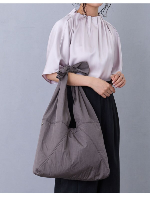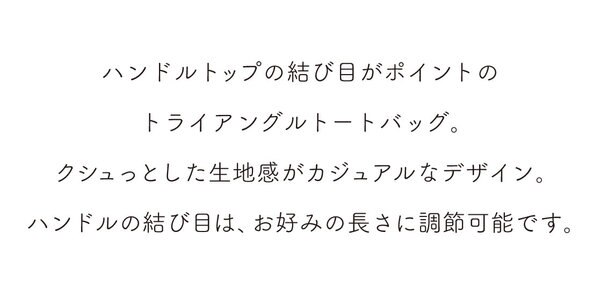 ハンドルの結び目がポイントのトライアングルトートは、くしゅっとした素材感が抜け感を演出。