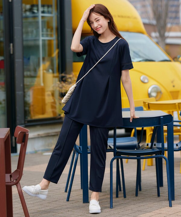 前タックで魅せるきれいなAラインシルエットのカットソーチュニック。サラっとした手触りの生地にひんやり接触冷感機能と紫外線対策の嬉しい機能性で爽やかな着心地に。夏のお悩みを忘れちゃう機能性を、ぜひチェックしてみてください。