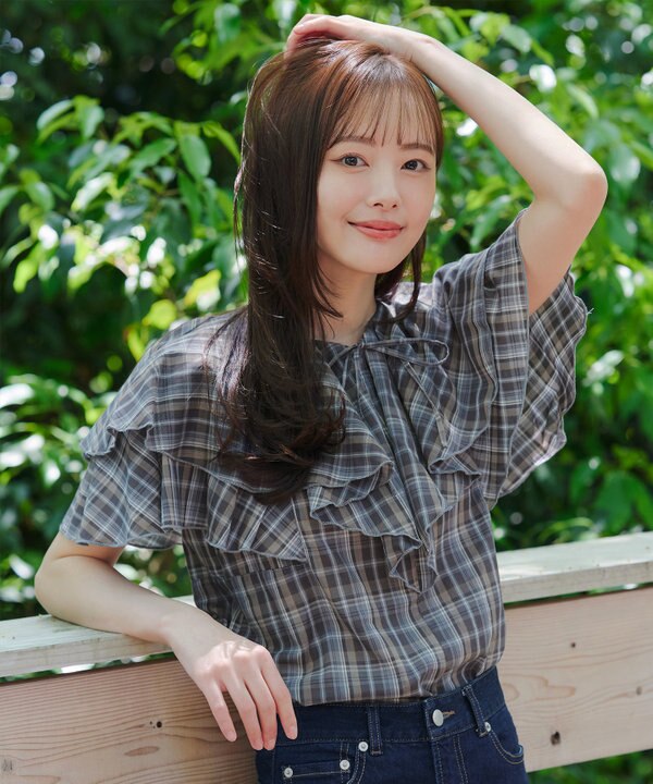 フリルがかわいいブラウスは秋を先取りできるチェック柄がポイント。暑さにも負けない薄手の生地感なので、いま買い足すのにおすすめ。