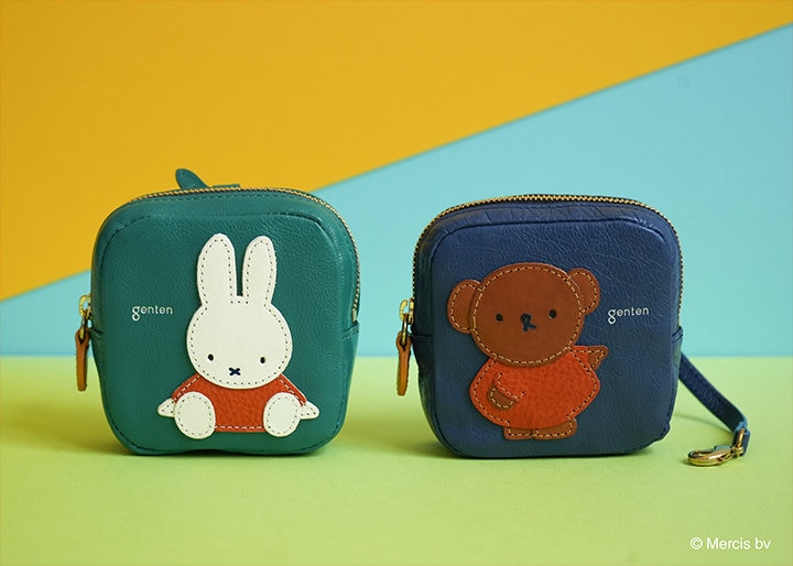 しっとりとした柔らかな手触りのカーフ素材のポーチに、おすわりポーズのミッフィーと、なにか語りかけてくるようなボリスを添えました。
