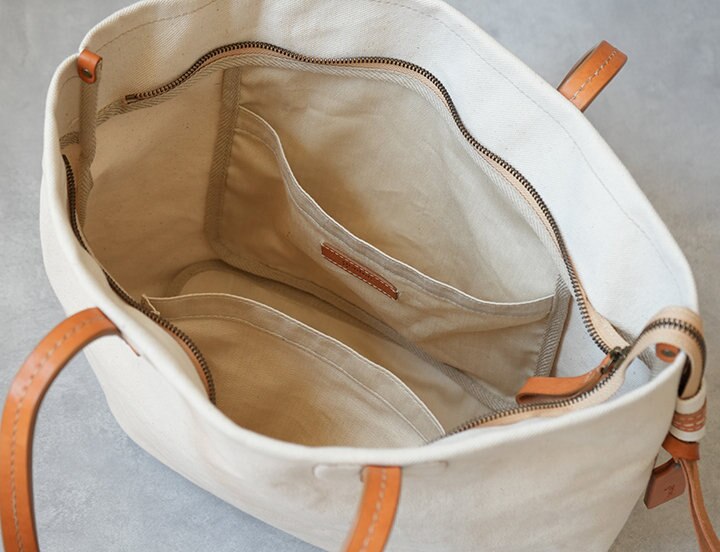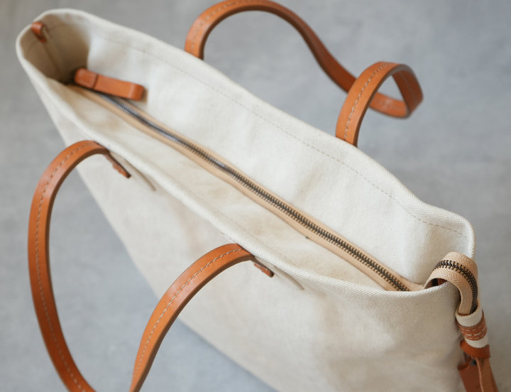 本体は、裏地のないすっきりとした一枚仕立てです。口元は少し落とし気味の天ファスナーを付けました。開けたままトートバッグ風に使うこともできます。