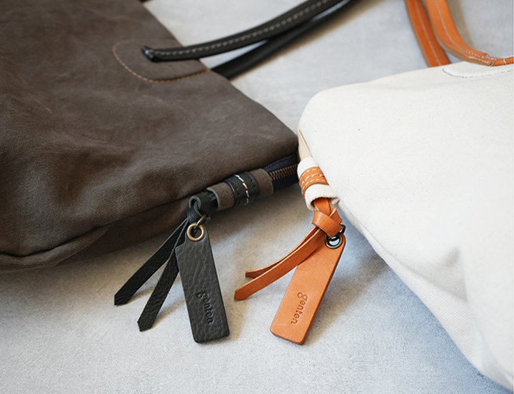 要所にあしらわれた革細工は、機械での量産ができないところ。革の端の始末やロゴの素押しなど、gentenの革職人ならではの技がバッグを引き立てます。