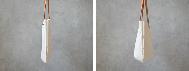 しっかりした帆布なので、角張りが出て身体にあたらないよう型紙や仕立てを工夫した結果、全体が丸みをおびたやさしいシルエットが完成しました。