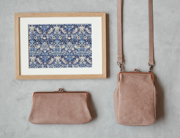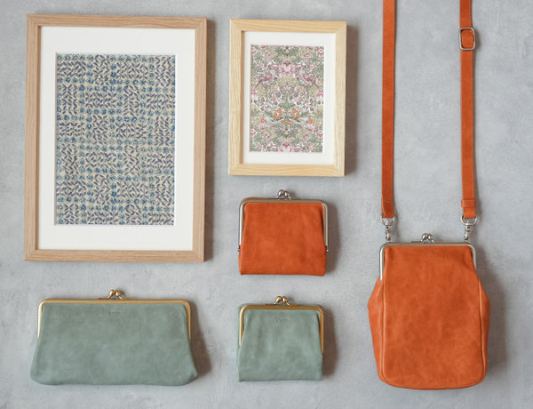 お財布2型とミニポシェット1型の全3型に、ユーカリ、オレンジ、サンドピンクの3色が仲間入り。それぞれのカラーの内装にリバティのテキスタイルを合わせました。