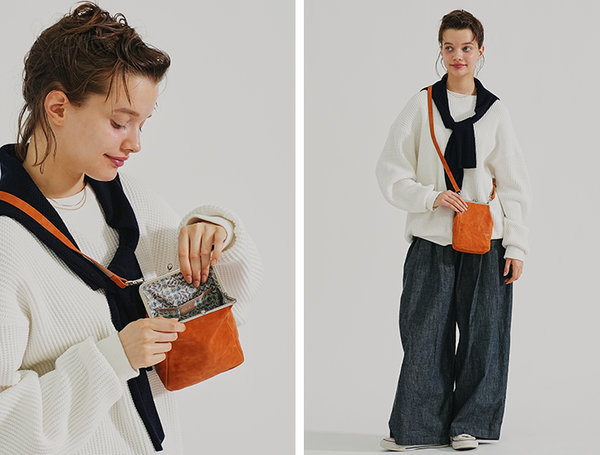 左から二つ折り財布(オレンジ)27,500円(税込)、ミニポシェット(オレンジ)30,800円(税込)
