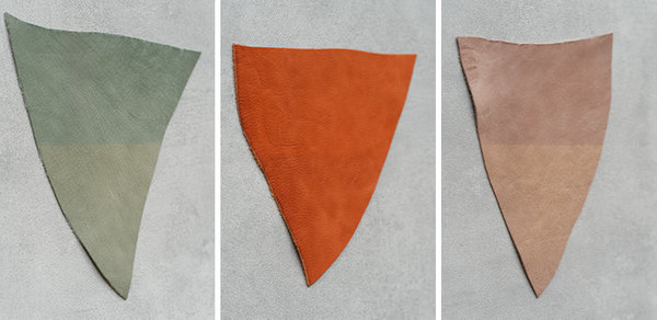 こちらは、下半分にだけ日光を当て続けて色の日焼けによる変化をテストした革です。ユーカリは、フレッシュなグリーンから青みが冷めて落ち着いた色味に。オレンジは、少しずつ色が濃くなっていきます。サンドピンクは、くすみのあるさらにシックなピンクへ。
