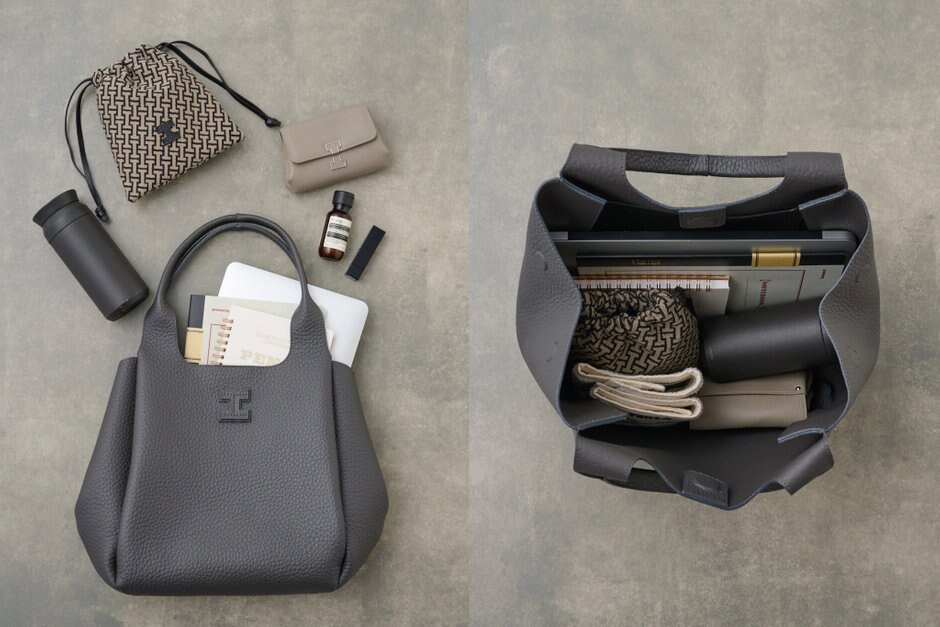 一見デイリーに使いやすいトートバッグですが、サイドに隠されたマグネットで横マチを広げると、A4サイズやノートパソコンが入るほどの大容量に。