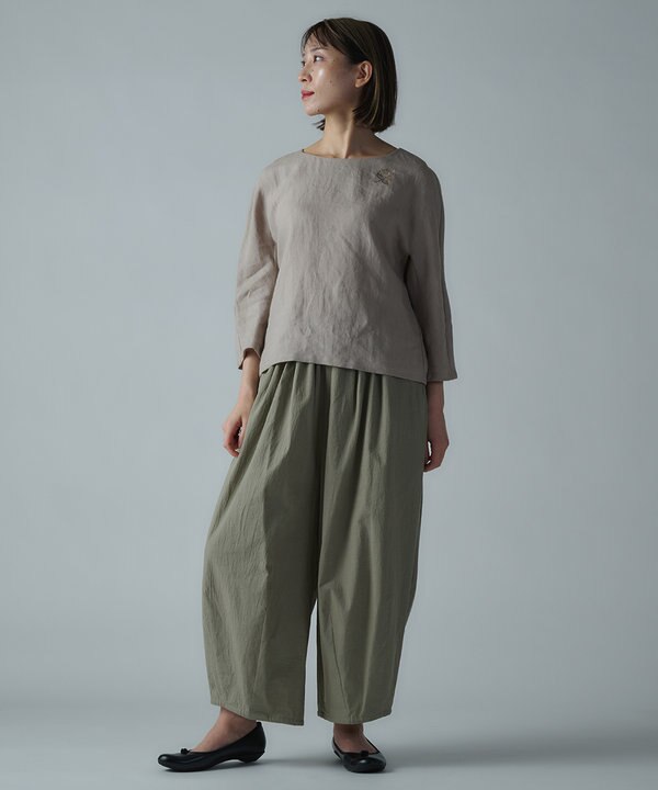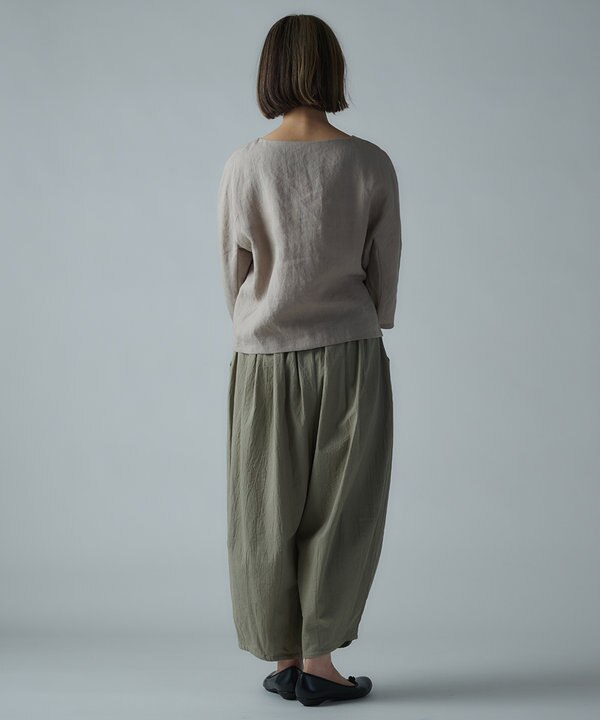 通気性と丈夫さにすぐれたリネンのトップスは、ベルギー・コルトレイク地方の美しい自然の中で育てられたリネンを、静岡県浜松市の遠州織物の工場で、こだわりの製法により生地にしたものです。