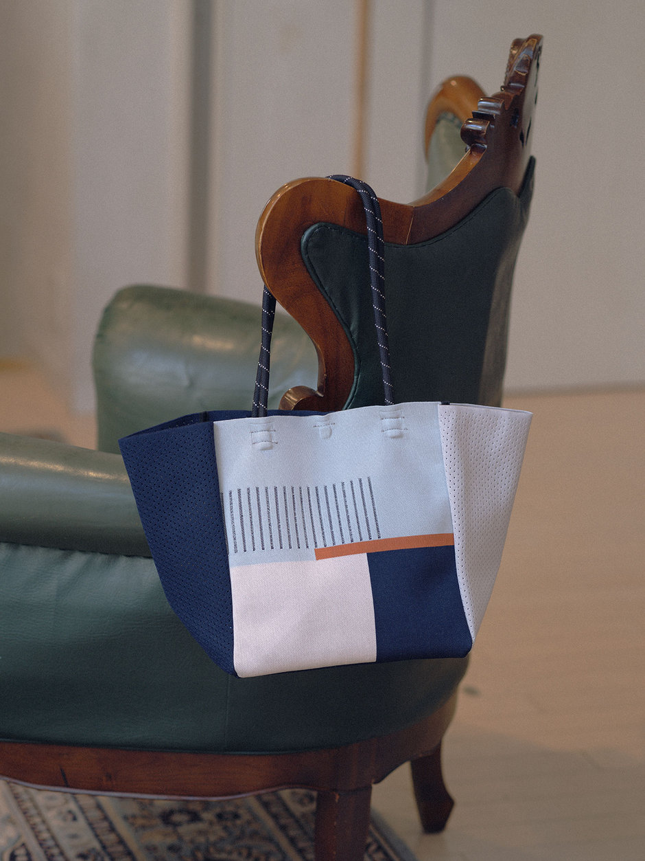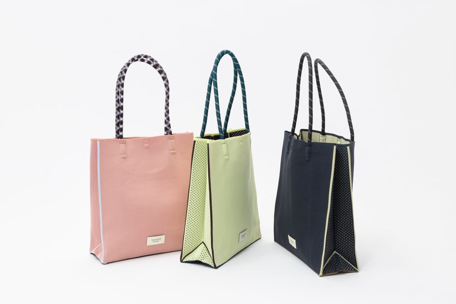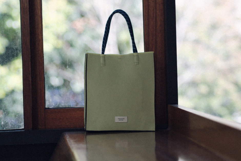 再生ポリエステルを使用した、エコ素材のニットトートバック。紙袋のようなすっきりとしたシルエットになっています。