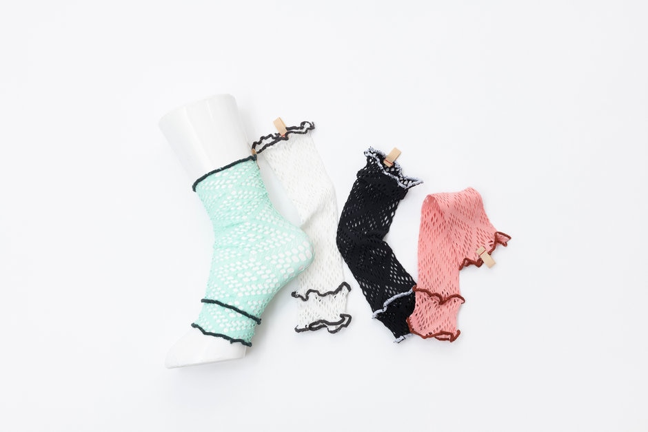 タイツを作るダブルラッセル機で編まれたレースをカットし、染色・縫製したソックス。伸縮性があり、履き口がメロー仕上げなので、ゆったりと快適にお履きいただけます。
