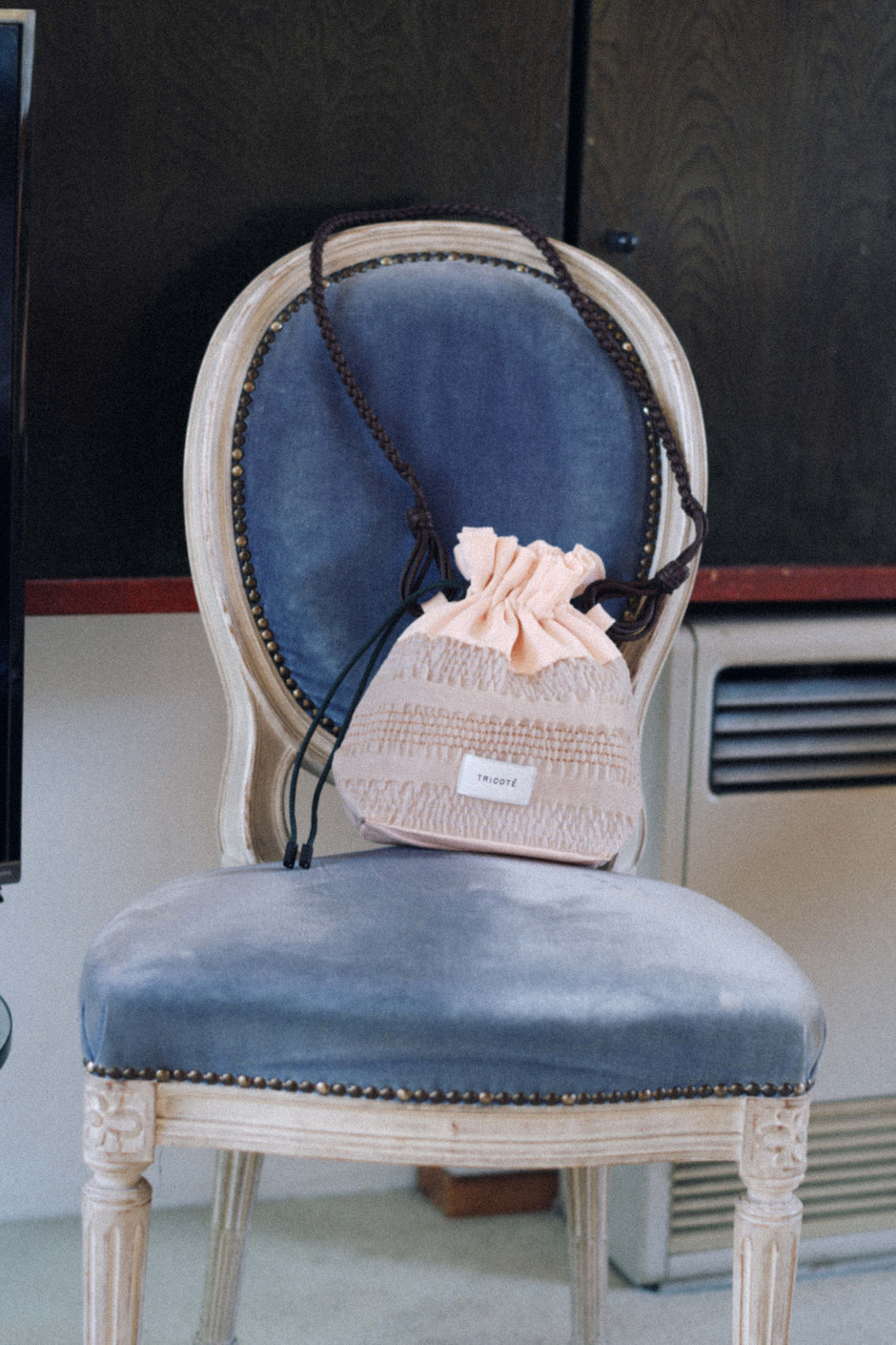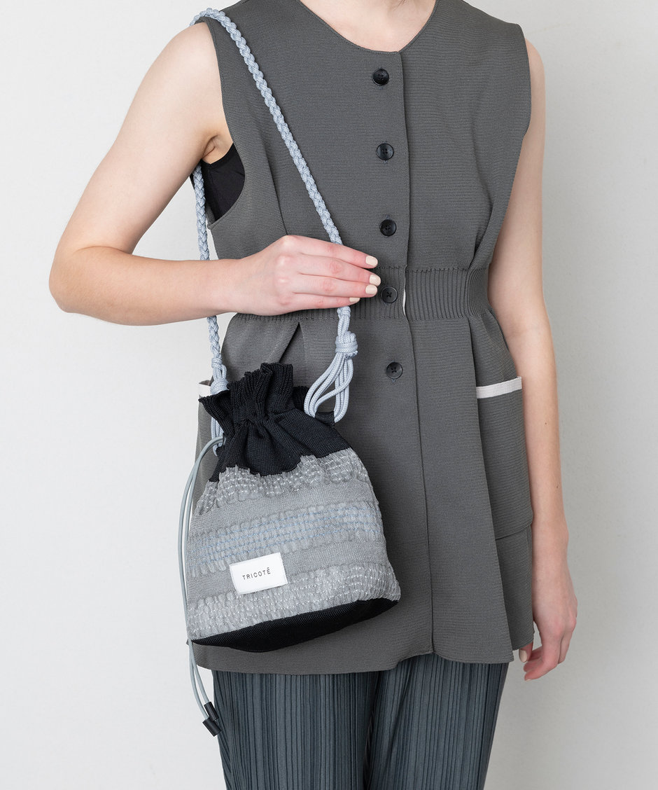 巾着型の小ぶりなサイズがかわいらしく、財布やコスメポーチなどが入ります。アクセサリー感覚で合わせて頂いても♪