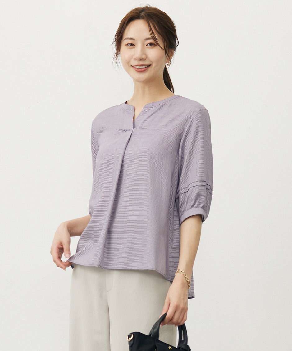 サラっとした肌触りで着心地が良く、キーネックで首周りに涼し気な印象を与えたブラウス。
