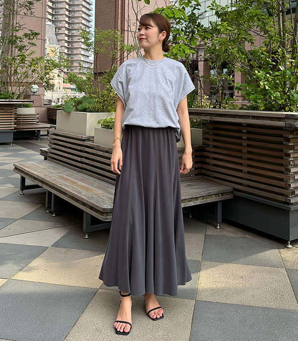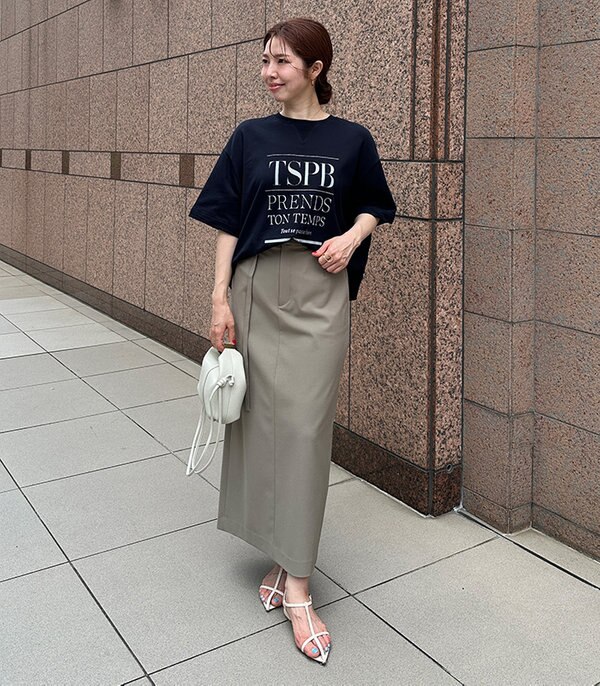 スカート×Tシャツのスタイリングも、素材感を変えれば秋らしいコーデに🍂
