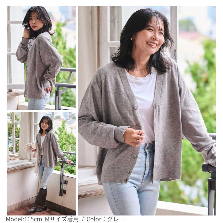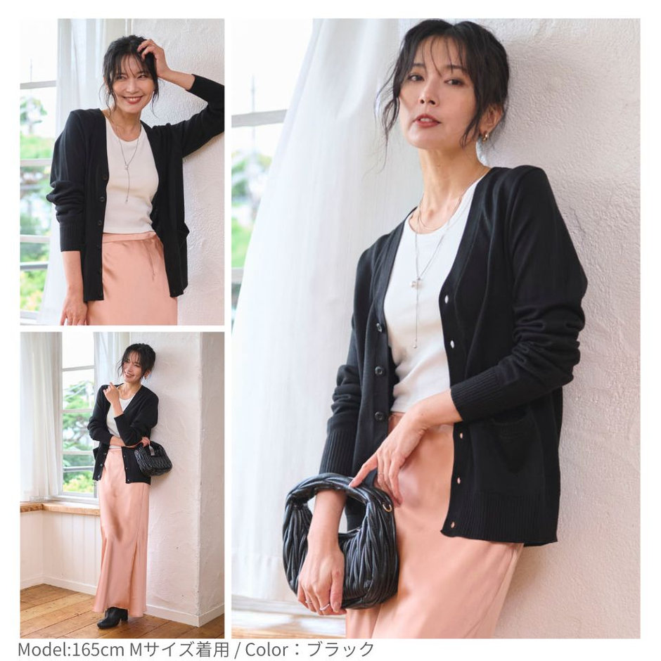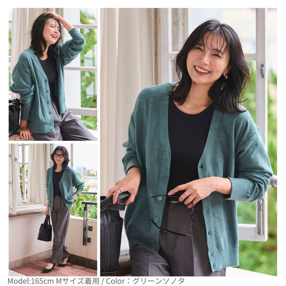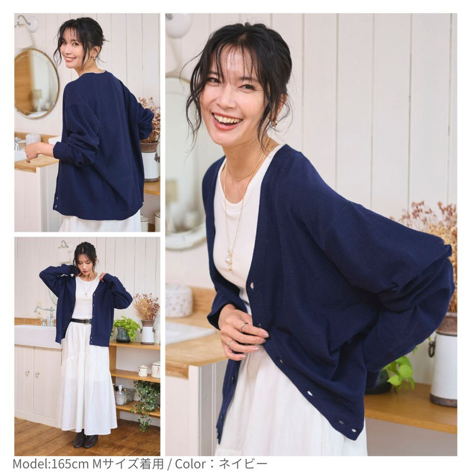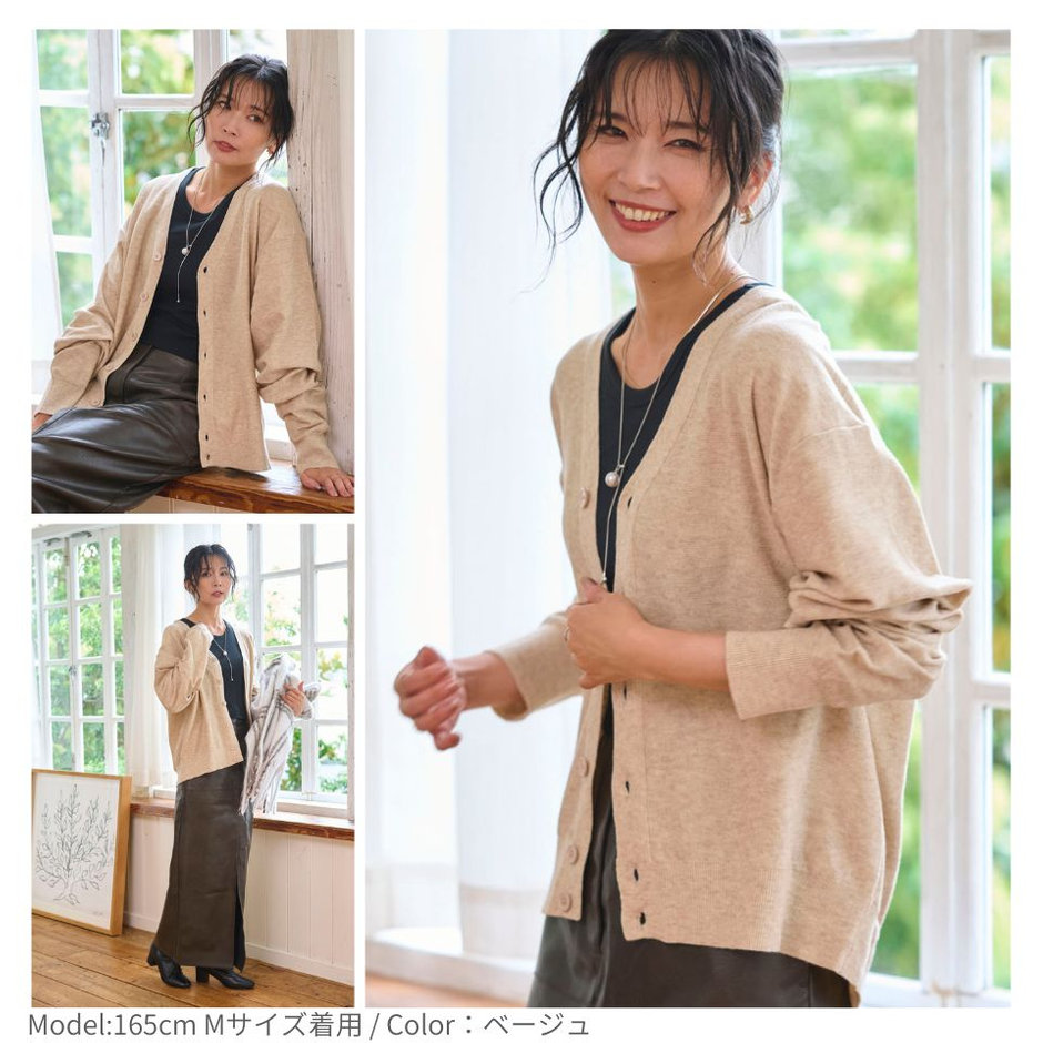 ゆるっと羽織れる落ち感シルエットが魅力のドロップショルダーカーディガン。