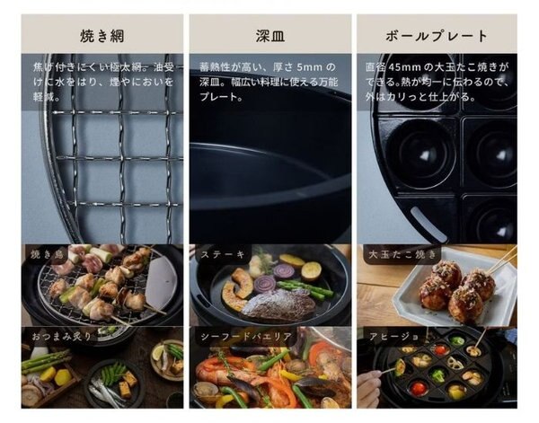 焼き網、深皿、ボールプレート、土鍋、蒸し皿の5種類のプレートが付属。種類の豊富さだけでなく、それぞれおいしさや使い勝手にもこだわっています。