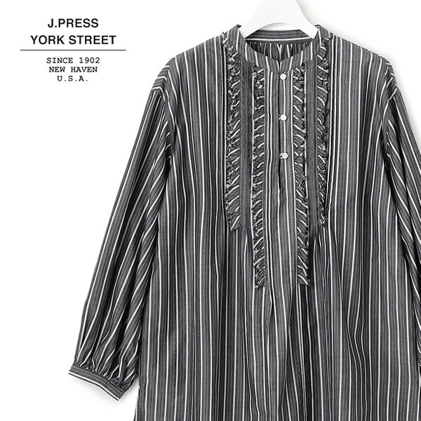 すっきりとしたバンドカラーと、繊細なストライプ柄が、清潔感とスマートな印象を与えます。