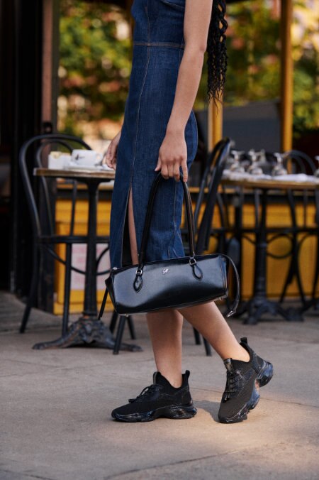 サイドにあしらわれた繊細なラインストーンと、アッパーのニット素材の異素材コンビが、足元にさりげないラグジュアリー感をプラスします。