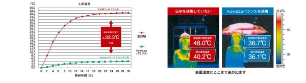 傘の製品遮熱性評価試験において32.3℃の差が認められました。