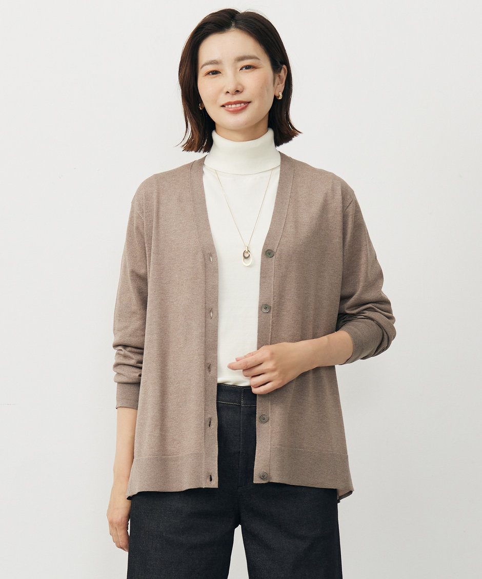 さらっと羽織るだけできちんと見えが叶う、異素材切り替えが上品なニットカーディガン